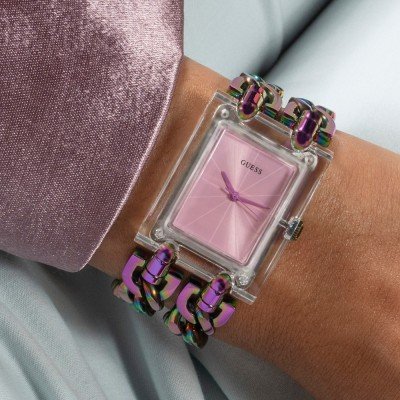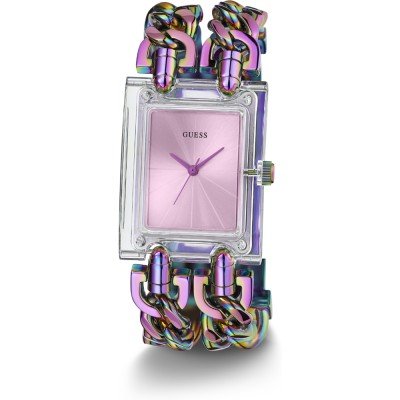 Diese Guess Uhr hat ein Edelstahl Gehäuse mit einem Durchmesser von 29 mm und ist mit einem Armband aus Edelstahl versehen.