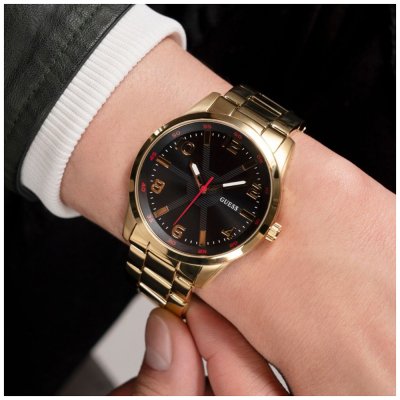 Diese Guess Uhr hat ein Edelstahl Gehäuse mit einem Durchmesser von 42 mm und ist mit einem Armband aus Edelstahl versehen.