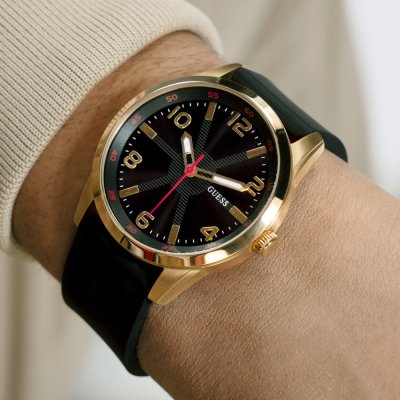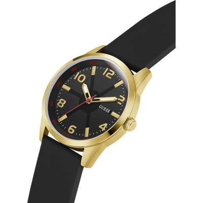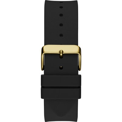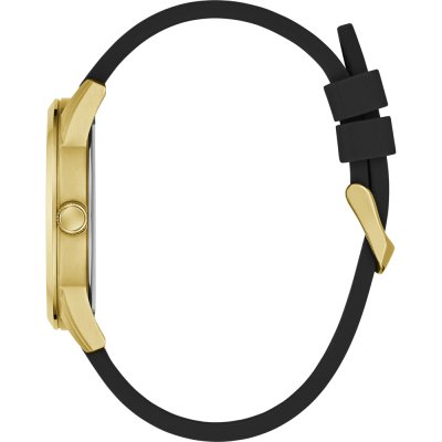 Diese Guess Uhr hat ein Edelstahl Gehäuse mit einem Durchmesser von 42 mm und ist mit einem Armband aus Kautschuk versehen.
