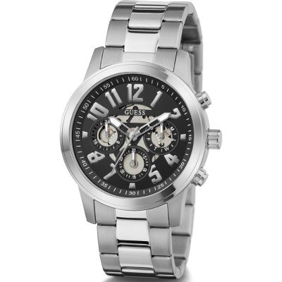 Diese Guess Uhr hat ein Edelstahl Gehäuse mit einem Durchmesser von 44 mm und ist mit einem Armband aus Edelstahl versehen. In der Uhr arbeitet ein Seiko Instruments Inc. Uhrwerk. Das Glas der Uhr besteht aus Mineral - Glas.
