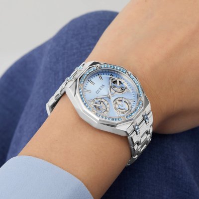 Diese Guess Uhr hat ein Edelstahl Gehäuse mit einem Durchmesser von 36 mm und ist mit einem Armband aus Edelstahl versehen. In der Uhr arbeitet ein Seiko Instruments Inc. Uhrwerk. Das Glas der Uhr besteht aus Mineral - Glas.
