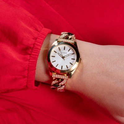 Diese Guess Uhr hat ein Edelstahl Gehäuse mit einem Durchmesser von 32 mm und ist mit einem Armband aus Edelstahl versehen. In der Uhr arbeitet ein Seiko Uhrwerk. Das Glas der Uhr besteht aus Mineral - Glas.