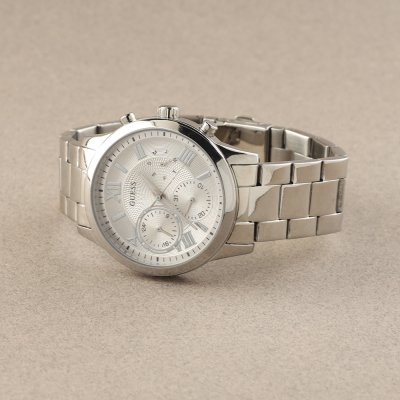 Diese Guess Uhr hat ein Edelstahl Gehäuse mit einem Durchmesser von 40 mm und ist mit einem Armband aus Edelstahl versehen. In der Uhr arbeitet ein Seiko Instruments Inc. Uhrwerk. Das Glas der Uhr besteht aus Mineral - Glas.