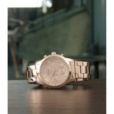 Diese Guess Uhr hat ein Edelstahl Gehäuse mit einem Durchmesser von 40 mm und ist mit einem Armband aus Edelstahl versehen. In der Uhr arbeitet ein Seiko Instruments Inc. Uhrwerk. Das Glas der Uhr besteht aus Mineral - Glas.