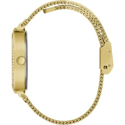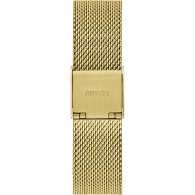 Diese Guess Uhr hat ein Edelstahl Gehäuse mit einem Durchmesser von 32 mm und ist mit einem Armband aus Metall versehen.