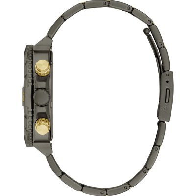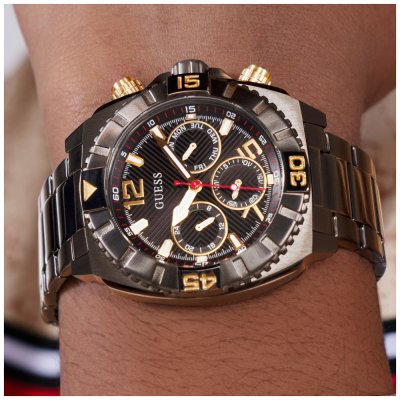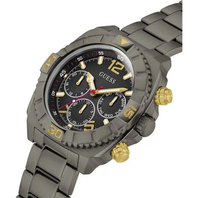 Diese Guess Uhr hat ein Edelstahl Gehäuse mit einem Durchmesser von 44 mm und ist mit einem Armband aus Metall versehen.