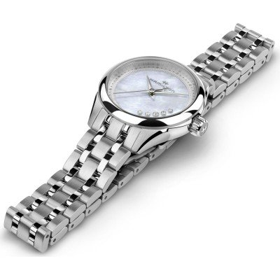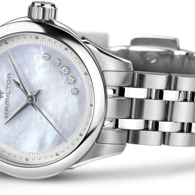 Diese Hamilton Uhr hat ein Edelstahl Gehäuse mit einem Durchmesser von 26 mm und ist mit einem Armband aus Edelstahl versehen. In der Uhr arbeitet ein ETA Uhrwerk. Das Glas der Uhr besteht aus Sapphir - Glas.