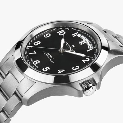 Diese Hamilton Uhr hat ein Edelstahl Gehäuse mit einem Durchmesser von 40 mm und ist mit einem Armband aus Edelstahl versehen. In der Uhr arbeitet ein ETA Uhrwerk. Das Glas der Uhr besteht aus Einfaches reflektionsfreies Saphirglas - Glas.