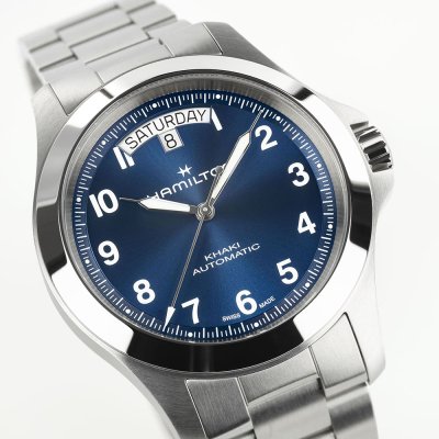 Diese Hamilton Uhr hat ein Edelstahl Gehäuse mit einem Durchmesser von 40 mm und ist mit einem Armband aus Edelstahl versehen. In der Uhr arbeitet ein ETA Uhrwerk. Das Glas der Uhr besteht aus Einfaches reflektionsfreies Saphirglas - Glas.
