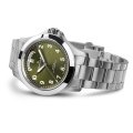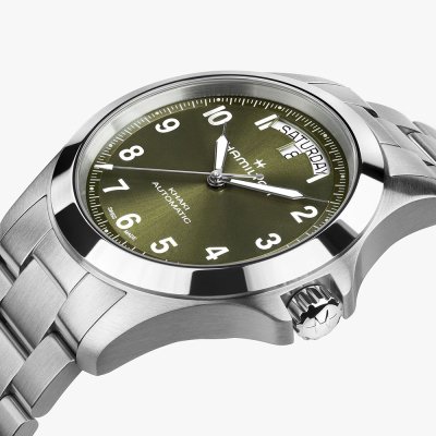 Diese Hamilton Uhr hat ein Edelstahl Gehäuse mit einem Durchmesser von 40 mm und ist mit einem Armband aus Edelstahl versehen. In der Uhr arbeitet ein ETA Uhrwerk. Das Glas der Uhr besteht aus Einfaches reflektionsfreies Saphirglas - Glas.