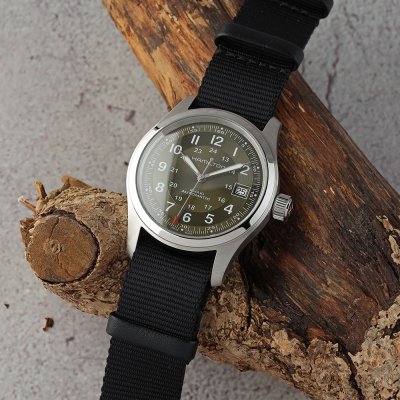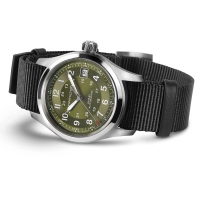Diese Hamilton Uhr hat ein Edelstahl Gehäuse mit einem Durchmesser von 38 mm und ist mit einem Armband aus Textil versehen. In der Uhr arbeitet ein ETA Uhrwerk. Das Glas der Uhr besteht aus Sapphir - Glas.