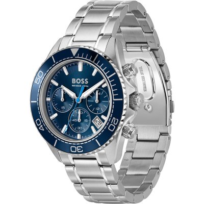 Diese Hugo Boss Uhr hat ein Edelstahl Gehäuse mit einem Durchmesser von 44 mm und ist mit einem Armband aus Edelstahl versehen.