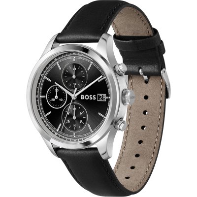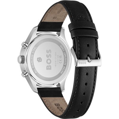 Diese Hugo Boss Uhr hat ein Edelstahl Gehäuse mit einem Durchmesser von 41 mm und ist mit einem Armband aus Leder versehen.