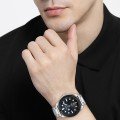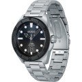 Diese Hugo Boss Uhr hat ein Edelstahl Gehäuse mit einem Durchmesser von 44 mm und ist mit einem Armband aus Edelstahl versehen. In der Uhr arbeitet ein Miyota Uhrwerk. Das Glas der Uhr besteht aus Mineral - Glas.
