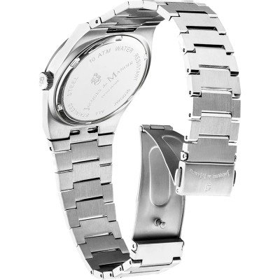 Diese Jacques du Manoir Uhr hat ein Edelstahl Gehäuse mit einem Durchmesser von 41 mm und ist mit einem Armband aus Edelstahl versehen. In der Uhr arbeitet ein Ronda Uhrwerk. Das Glas der Uhr besteht aus Mineral - Glas.