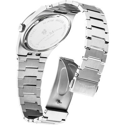 Diese Jacques du Manoir Uhr hat ein Edelstahl Gehäuse mit einem Durchmesser von 41 mm und ist mit einem Armband aus Edelstahl versehen. In der Uhr arbeitet ein Ronda Uhrwerk. Das Glas der Uhr besteht aus Mineral - Glas.