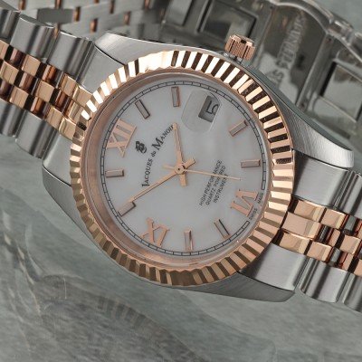 Diese Jacques du Manoir Uhr hat ein Edelstahl Gehäuse mit einem Durchmesser von 34 mm und ist mit einem Armband aus Edelstahl versehen. In der Uhr arbeitet ein Ronda Uhrwerk. Das Glas der Uhr besteht aus Mineral - Glas.