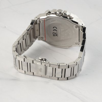 Diese Jaguar Uhr hat ein Edelstahl Gehäuse mit einem Durchmesser von 42.9 mm und ist mit einem Armband aus Edelstahl versehen. In der Uhr arbeitet ein Ronda Uhrwerk. Das Glas der Uhr besteht aus Sapphir - Glas.