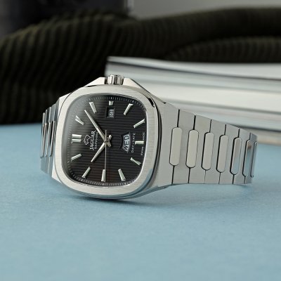 Diese Jaguar Uhr hat ein Edelstahl Gehäuse mit einem Durchmesser von 41 mm und ist mit einem Armband aus Edelstahl versehen. In der Uhr arbeitet ein Ronda Uhrwerk. Das Glas der Uhr besteht aus Sapphir - Glas.
