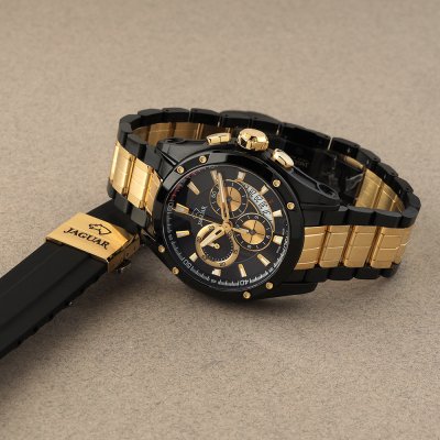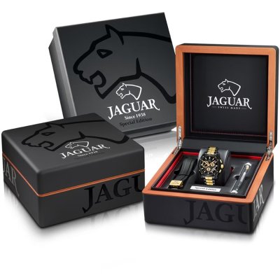 Diese Jaguar Uhr hat ein Edelstahl Gehäuse mit einem Durchmesser von 45 mm und ist mit einem Armband aus Edelstahl versehen. In der Uhr arbeitet ein Ronda Uhrwerk. Das Glas der Uhr besteht aus Sapphir - Glas.