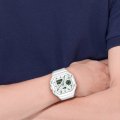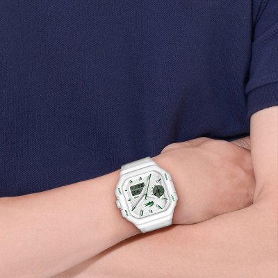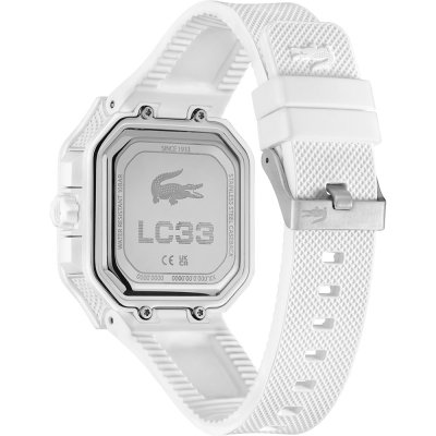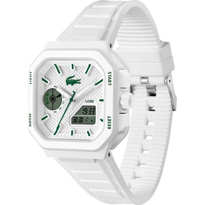 Diese Lacoste Uhr hat ein Kunstharz Gehäuse mit einem Durchmesser von 44 mm und ist mit einem Armband aus Kautschuk versehen.