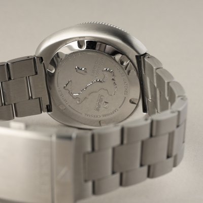 Diese Ligure Uhr hat ein Edelstahl Gehäuse mit einem Durchmesser von 41 mm und ist mit einem Armband aus Edelstahl versehen. In der Uhr arbeitet ein ETA Uhrwerk. Das Glas der Uhr besteht aus Sapphir - Glas.