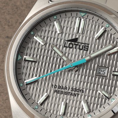 Diese Lotus Uhr hat ein Edelstahl Gehäuse mit einem Durchmesser von 42 mm und ist mit einem Armband aus Edelstahl versehen. In der Uhr arbeitet ein Miyota Uhrwerk. Das Glas der Uhr besteht aus Mineral - Glas.