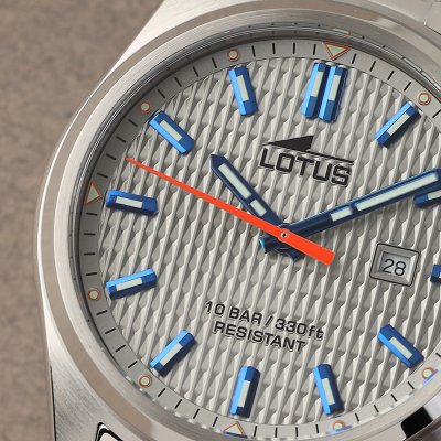 Diese Lotus Uhr hat ein Edelstahl Gehäuse mit einem Durchmesser von 42 mm und ist mit einem Armband aus Edelstahl versehen. In der Uhr arbeitet ein Miyota Uhrwerk. Das Glas der Uhr besteht aus Mineral - Glas.