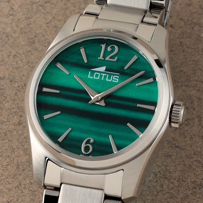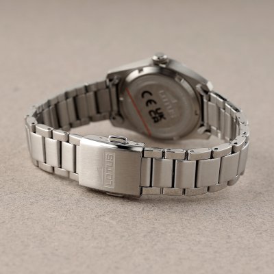 Diese Lotus Uhr hat ein Edelstahl Gehäuse mit einem Durchmesser von 32 mm und ist mit einem Armband aus Edelstahl versehen. In der Uhr arbeitet ein Miyota Uhrwerk. Das Glas der Uhr besteht aus Mineral - Glas.