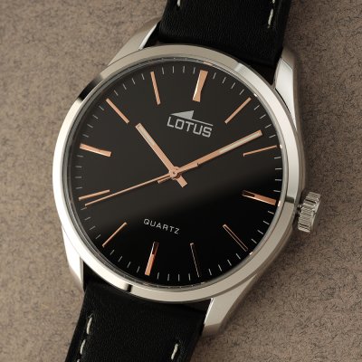 Diese Lotus Uhr hat ein Edelstahl Gehäuse mit einem Durchmesser von 42 mm und ist mit einem Armband aus Leder versehen. In der Uhr arbeitet ein Miyota Uhrwerk. Das Glas der Uhr besteht aus Mineral - Glas.