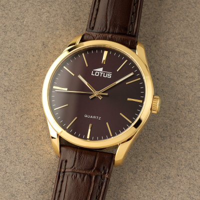 Diese Lotus Uhr hat ein Edelstahl Gehäuse mit einem Durchmesser von 42 mm und ist mit einem Armband aus Leder versehen. In der Uhr arbeitet ein Miyota Uhrwerk. Das Glas der Uhr besteht aus Mineral - Glas.