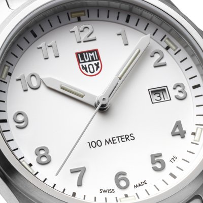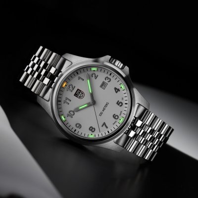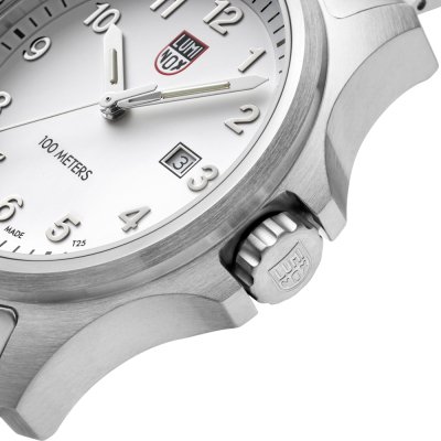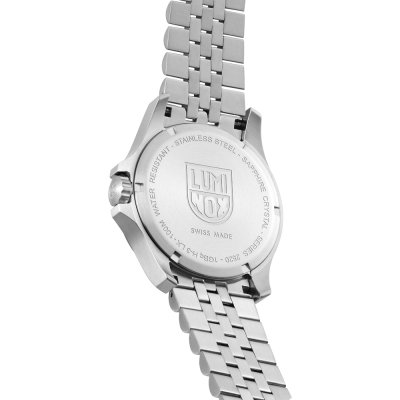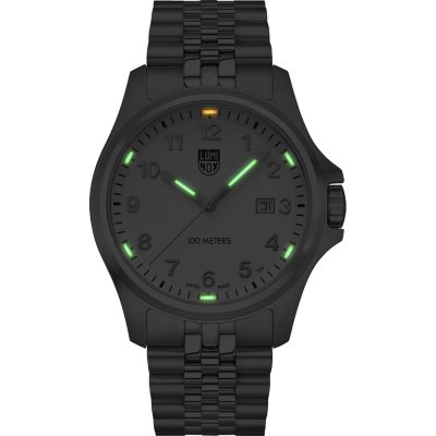 Diese Luminox Uhr hat ein Edelstahl Gehäuse mit einem Durchmesser von 43 mm und ist mit einem Armband aus Edelstahl versehen. In der Uhr arbeitet ein Ronda Uhrwerk. Das Glas der Uhr besteht aus Einfaches reflektionsfreies Saphirglas - Glas.