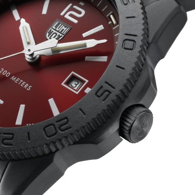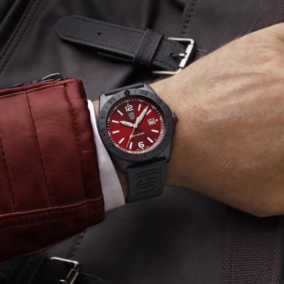 Diese Luminox Uhr hat ein Edelstahl Gehäuse mit einem Durchmesser von 44 mm und ist mit einem Armband aus Kautschuk versehen. In der Uhr arbeitet ein Ronda Uhrwerk. Das Glas der Uhr besteht aus Sapphir - Glas.