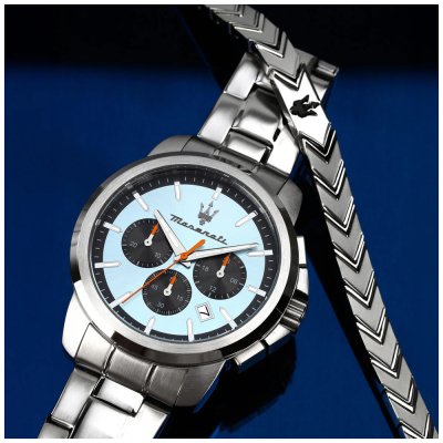 Diese Maserati Uhr hat ein Edelstahl Gehäuse mit einem Durchmesser von 42 mm und ist mit einem Armband aus Edelstahl versehen. In der Uhr arbeitet ein Miyota Uhrwerk. Das Glas der Uhr besteht aus Mineral - Glas.