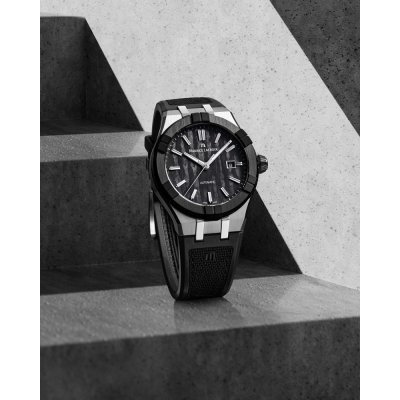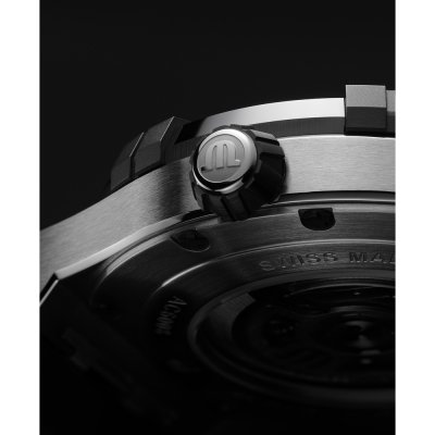 Diese Maurice Lacroix Uhr hat ein Edelstahl und Keramik Gehäuse mit einem Durchmesser von 43 mm und ist mit einem Armband aus Kautschuk versehen. In der Uhr arbeitet ein Sellita Uhrwerk. Das Glas der Uhr besteht aus Sapphir - Glas.