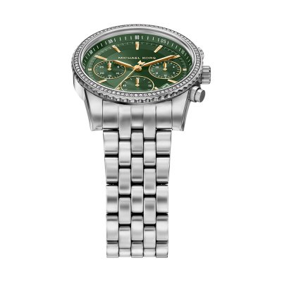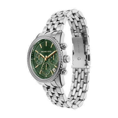 Diese Michael Kors Uhr hat ein Edelstahl Gehäuse mit einem Durchmesser von 35 mm und ist mit einem Armband aus Edelstahl versehen. In der Uhr arbeitet ein Miyota Uhrwerk. Das Glas der Uhr besteht aus Mineral - Glas.