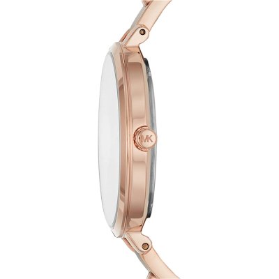 Diese Michael Kors Uhr hat ein Edelstahl Gehäuse mit einem Durchmesser von 36 mm und ist mit einem Armband aus Edelstahl versehen. In der Uhr arbeitet ein Seiko Instruments Inc. Uhrwerk. Das Glas der Uhr besteht aus Mineral - Glas.