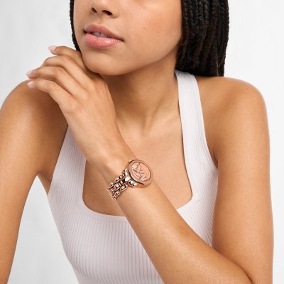 Diese Michael Kors Uhr hat ein Edelstahl Gehäuse mit einem Durchmesser von 36 mm und ist mit einem Armband aus Edelstahl versehen. In der Uhr arbeitet ein Seiko Uhrwerk. Das Glas der Uhr besteht aus Mineral - Glas.