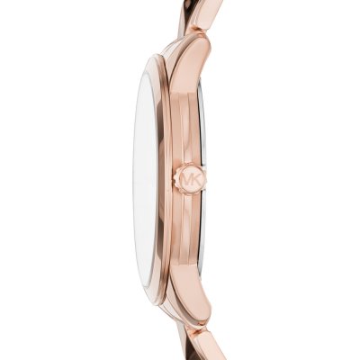 Diese Michael Kors Uhr hat ein Edelstahl Gehäuse mit einem Durchmesser von 38 mm und ist mit einem Armband aus Edelstahl versehen. In der Uhr arbeitet ein Seiko Instruments Inc. Uhrwerk. Das Glas der Uhr besteht aus Mineral - Glas.