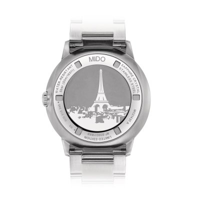 Diese MIDO Uhr hat ein Edelstahl Gehäuse mit einem Durchmesser von 40 mm und ist mit einem Armband aus Edelstahl versehen. In der Uhr arbeitet ein ETA Uhrwerk. Das Glas der Uhr besteht aus Sapphir - Glas.