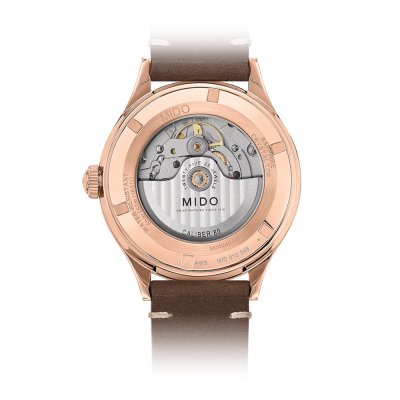 Diese MIDO Uhr hat ein Edelstahl Gehäuse mit einem Durchmesser von 40 mm und ist mit einem Armband aus Leder versehen. In der Uhr arbeitet ein ETA Uhrwerk. Das Glas der Uhr besteht aus Sapphir - Glas.