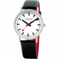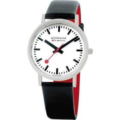 Diese Mondaine Uhr hat ein Edelstahl Gehäuse mit einem Durchmesser von 36 mm und ist mit einem Armband aus Leder versehen. In der Uhr arbeitet ein Ronda Uhrwerk. Das Glas der Uhr besteht aus Mineral - Glas.