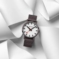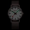 Diese Mondaine Uhr hat ein Edelstahl Gehäuse mit einem Durchmesser von 40 mm und ist mit einem Armband aus Edelstahl versehen. In der Uhr arbeitet ein Ronda Uhrwerk. Das Glas der Uhr besteht aus Gehärtetem Mineral - Glas.