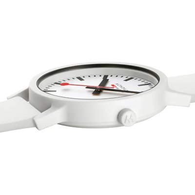Diese Mondaine Uhr hat ein Kunststoff / Harz Gehäuse mit einem Durchmesser von 41 mm und ist mit einem Armband aus Textil versehen. In der Uhr arbeitet ein Ronda Uhrwerk. Das Glas der Uhr besteht aus Gehärtetem Mineral - Glas.