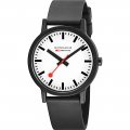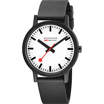 Diese Mondaine Uhr hat ein Kunststoff / Harz Gehäuse mit einem Durchmesser von 41 mm und ist mit einem Armband aus Kunststoff / Harz versehen. In der Uhr arbeitet ein Ronda Uhrwerk. Das Glas der Uhr besteht aus Gehärtetem Mineral - Glas.