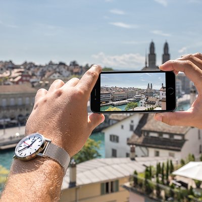 Diese Mondaine Uhr hat ein Edelstahl Gehäuse mit einem Durchmesser von 40 mm und ist mit einem Armband aus Edelstahl versehen. In der Uhr arbeitet ein Ronda Uhrwerk. Das Glas der Uhr besteht aus Sapphir - Glas.