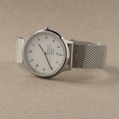 Diese Mondaine Uhr hat ein Edelstahl Gehäuse mit einem Durchmesser von 40 mm und ist mit einem Armband aus Metall versehen. In der Uhr arbeitet ein Ronda Uhrwerk. Das Glas der Uhr besteht aus Sapphir - Glas.