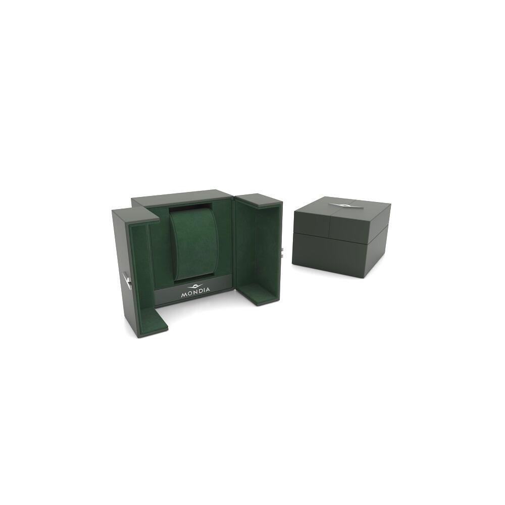 Diese Mondia Uhr hat ein Edelstahl Gehäuse mit einem Durchmesser von 43 mm und ist mit einem Armband aus Leder versehen. In der Uhr arbeitet ein Seiko Instruments Inc. Uhrwerk. Das Glas der Uhr besteht aus Mineral - Glas.