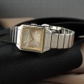 Die Movado Heritage-Kollektion schöpft aus der reichen Geschichte der Marke und bringt Vintage-Uhren zurück in die Gegenwart. Die geometrische Eleganz des Art déco spiegelt sich in den "Heritage 1917"-Uhren wider. Diese Uhr feiert die ersten quadratischen Movado-Uhren aus dem Jahr 1917 und erfindet sie neu. Sie hat ein geformtes Gehäuse mit klar definierten Linien, das ein architektonisches Gefühl vermittelt. Zeitgenössische Aktualisierungen des Originals sind ein neu gestaltetes Unilink-Armband oder ein reichhaltiges, vintage-inspiriertes, italienisch gegerbtes Lederarmband und ein Sonnenschliff-Ombré-Zifferblatt mit subtilen Tonverschiebungen, die an eine Deco-Skyline erinnern. Das Schweizer Sellita SW200-Automatikwerk mit einem speziell angefertigten Rotor im Deco-Design verfügt über glatte, geschwungene Zeiger und ist durch einen Saphirglasboden sichtbar.