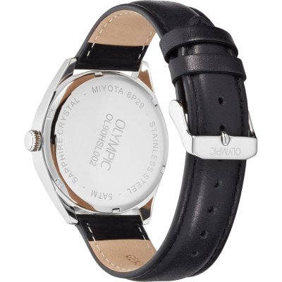 Diese Olympic Uhr hat ein Edelstahl Gehäuse mit einem Durchmesser von 40 mm und ist mit einem Armband aus Leder versehen. In der Uhr arbeitet ein Miyota Uhrwerk. Das Glas der Uhr besteht aus Sapphir - Glas.